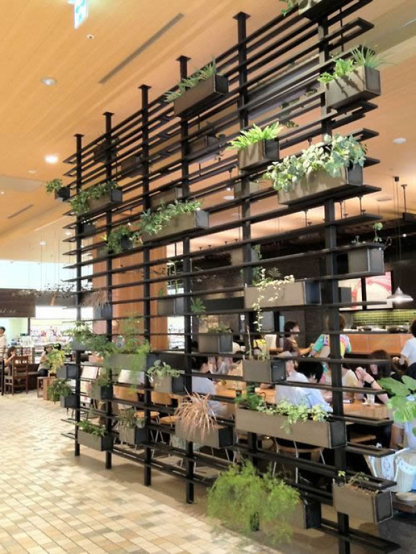 - Четвертая: перегородка состоит из полок одного размера, расположенных на одинаковой высоте, к полкам прикреплены деревянные ящики под цветы.